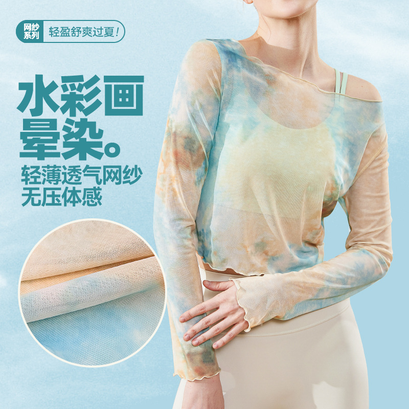 Mesh Yoga T-shirt Women’s Summer New Spice Girls Pure Desire Tie-dyed off-shoulder Thin Perspective Long-sleeved Blouse