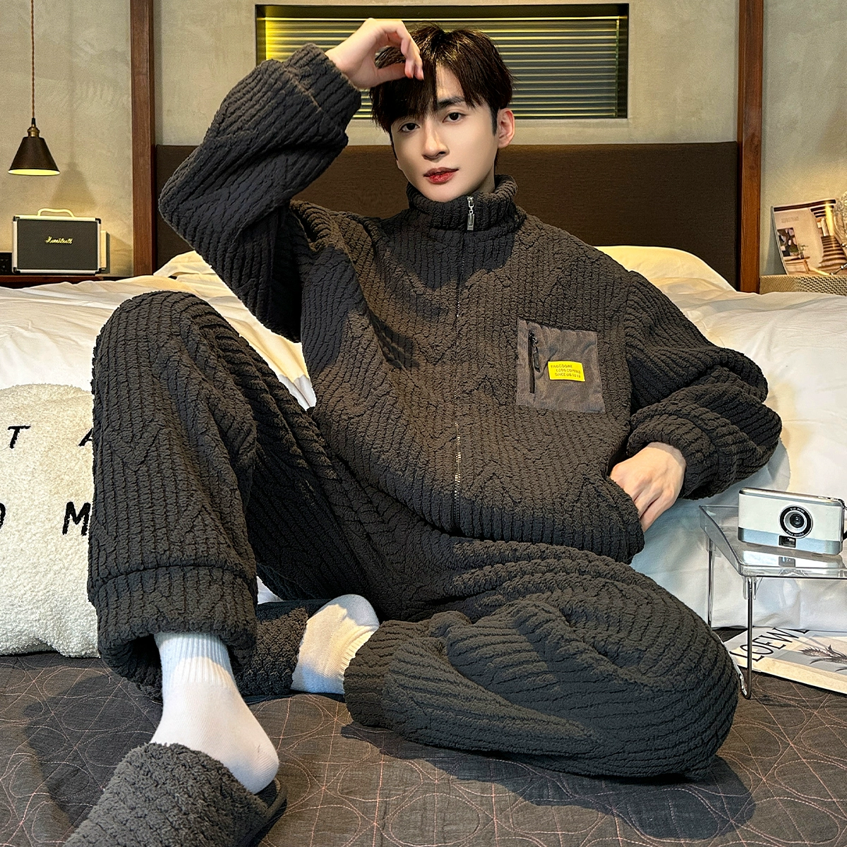 Lamb velvet pajamas for men in autumn and winter, thickened velvet coral velvet warm home clothes for teenagers, plus size suit