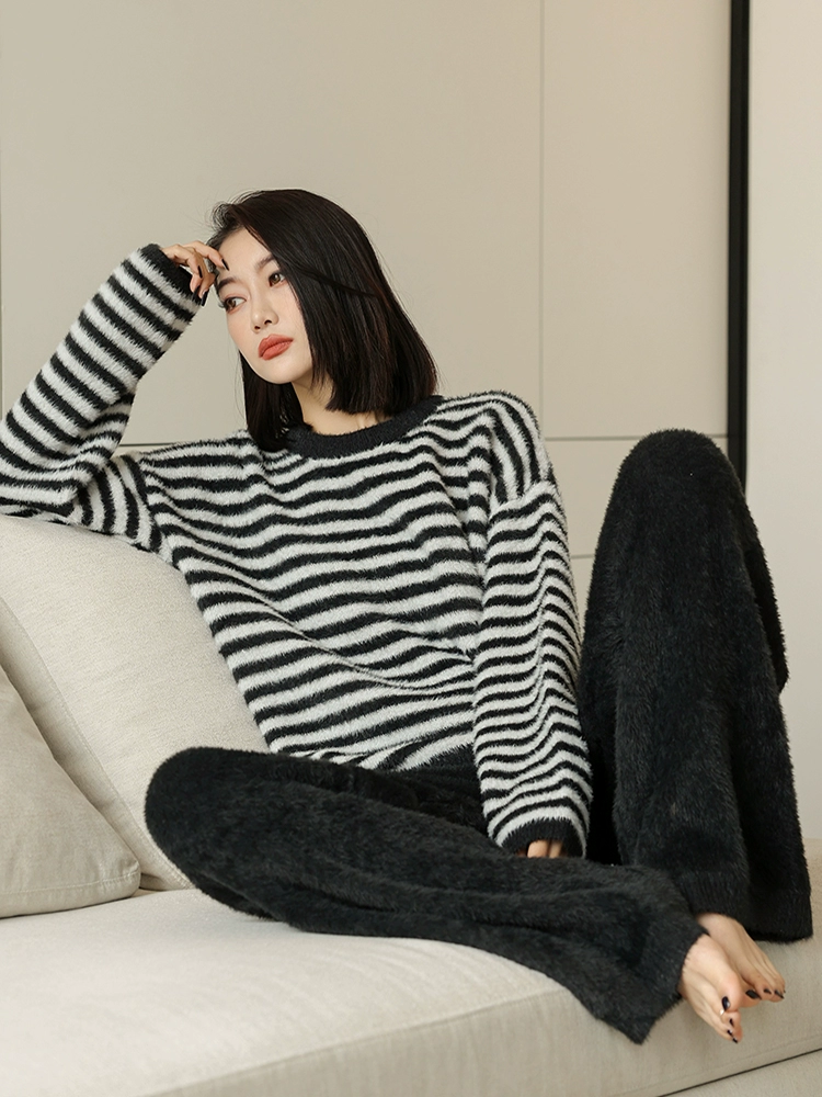 Bivelvet Pajamas Women’s Autumn and Winter Coral Velvet Plus Velvet Thickened Striped Plush Soft and Wearable Home Clothes Set