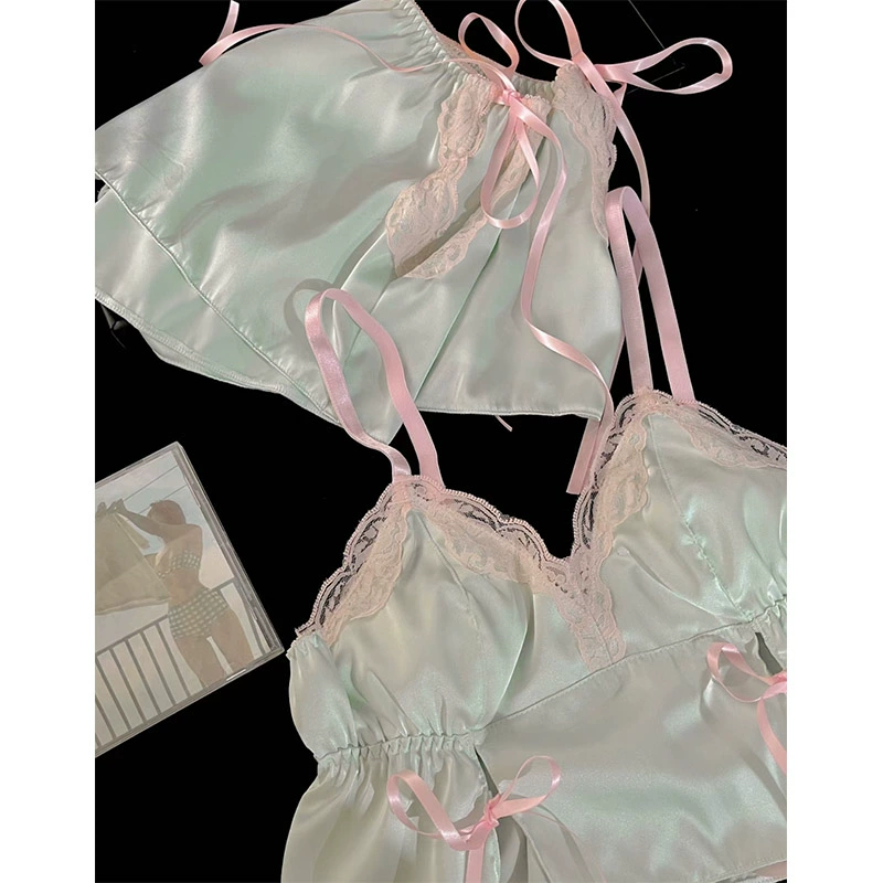 Bow cutout lace thin soft suspender shorts, sexy home clothing set, summer pajamas, two pieces of chest pads