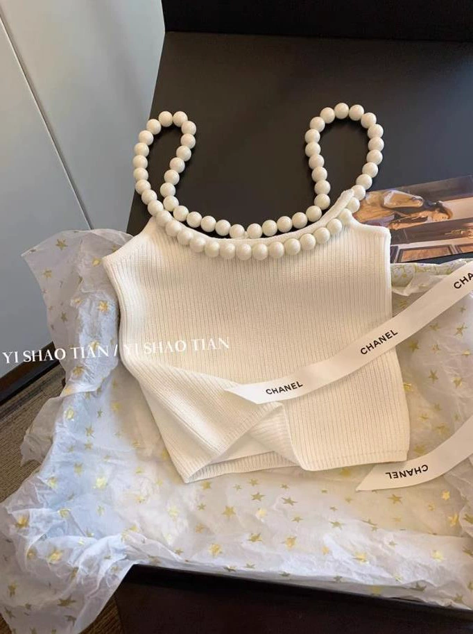White pearl hanging neck suspender vest female high -level sense 2024 summer new slimming, thin sexy knitted top