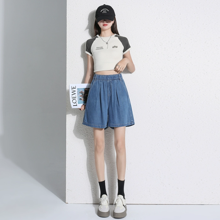 Tencel light-colored high-waisted wide-leg casual denim shorts