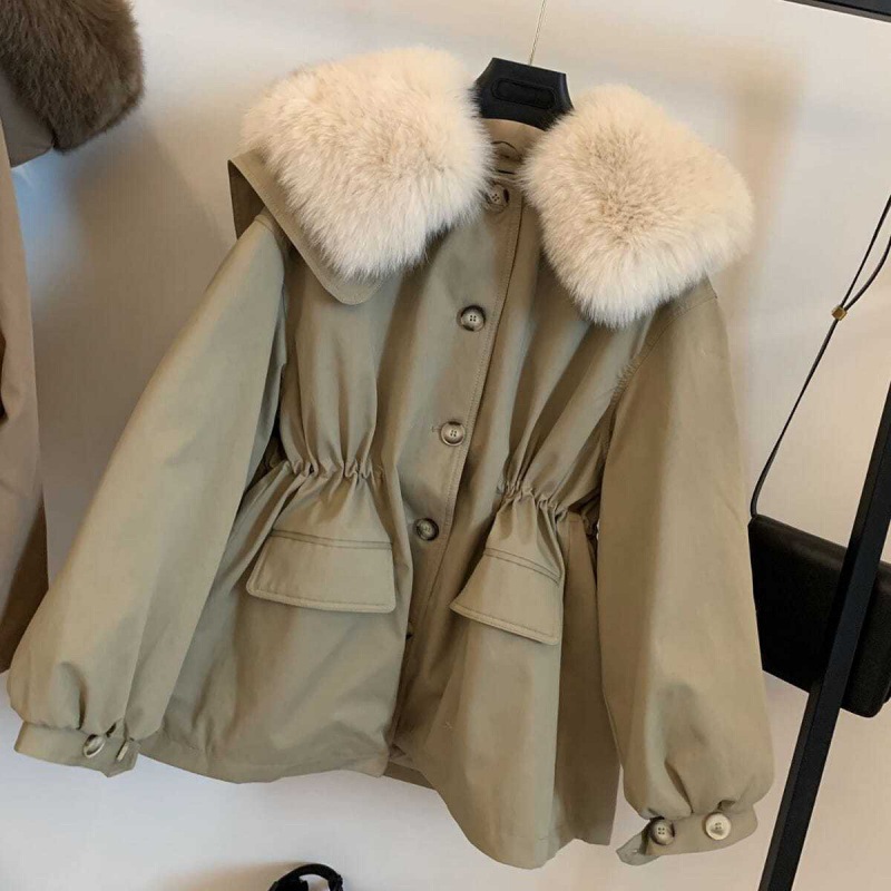 Hong Kong style retro thickened fur collar cotton-padded coat for women 2023 Winter new Korean style drawstring waist slimming large fur collar cotton-padded coat