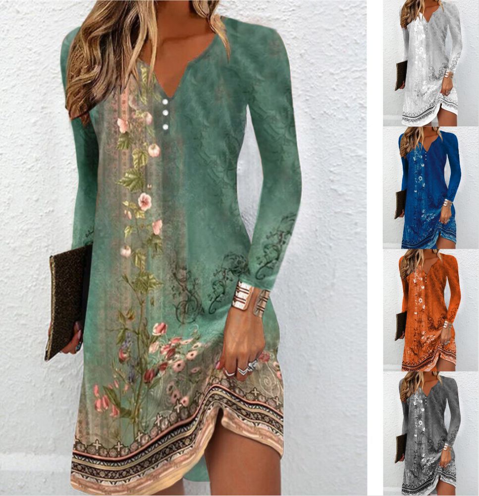 2023 Independent station wish Amazon explosion autumn long sleeve V-neck button irregular dress women’s clothing