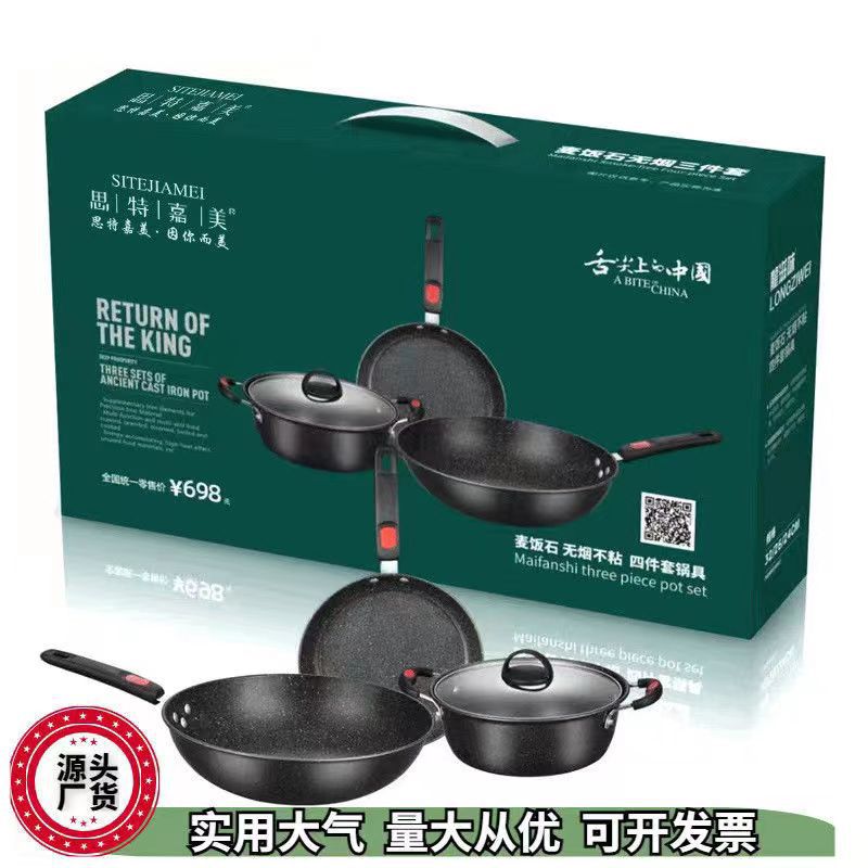 New Maifan Stone Wok Three-piece Set Thickened Non-stick Pan Flat Bottom Iron Pot Set Pot Activity Gift Pot