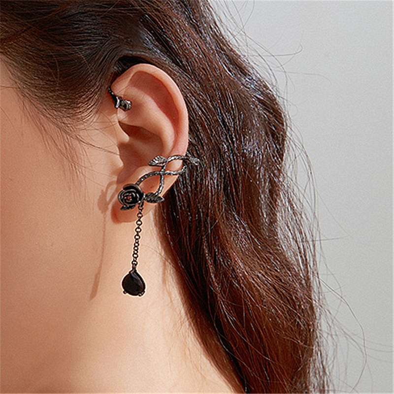 Black water drop tassel ear bone clip female niche design feeling Thorn Black Rose earrings rose earless ear hanging