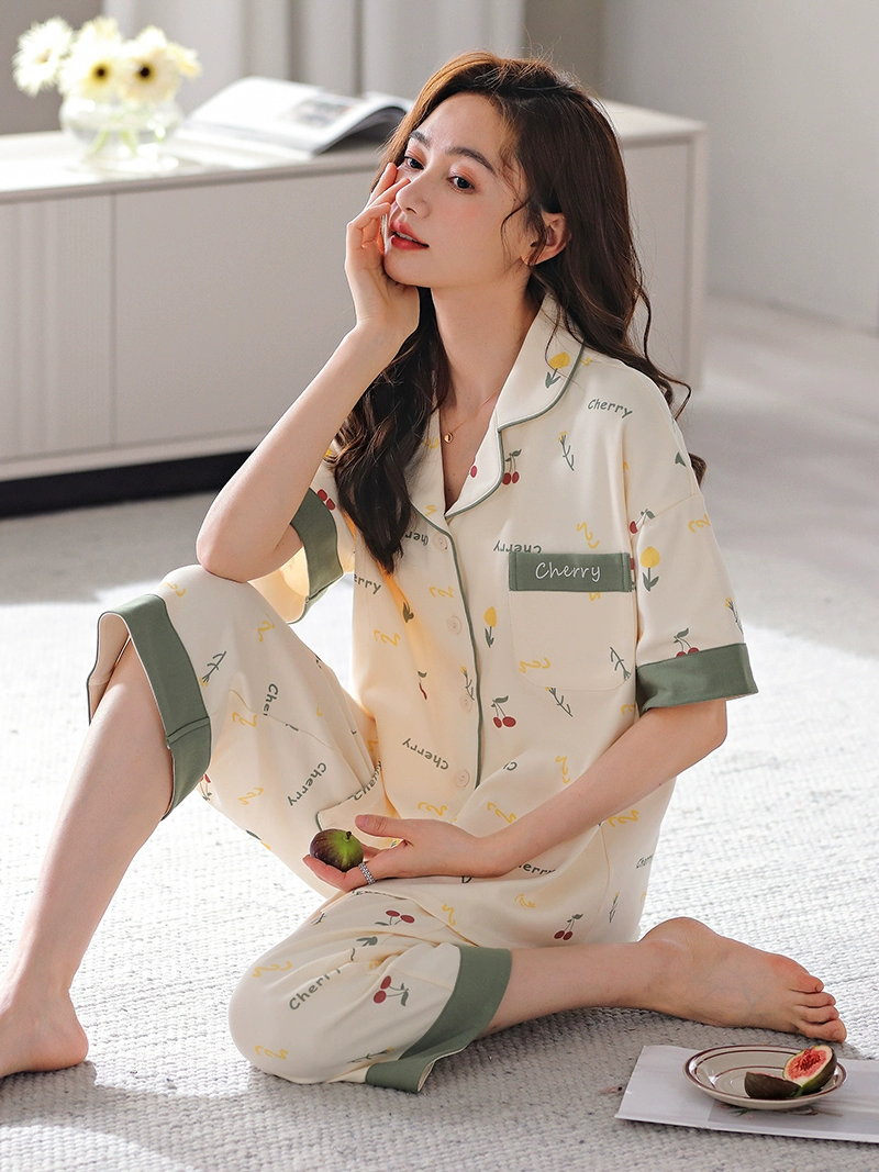 Pajamas women’s spring and summer pure cotton short-sleeved cropped pants thin casual cardigan large size for outdoor wear home clothing set