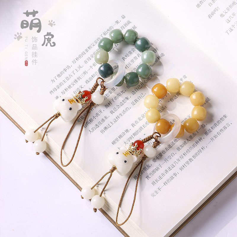 Natural style green Yin leather Bodhi milk mango yellow Bodhi rosary 10 ring buckle cute tiger creative mobile phone small pendant