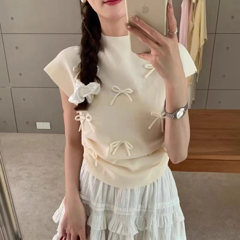 Korean Style Gentle Elegant Three-Dimensional Bow Round Neck Flying Sleeve Sweater Women’s Summer All-Match Slimming Short-Sleeved T-Shirt Trendy