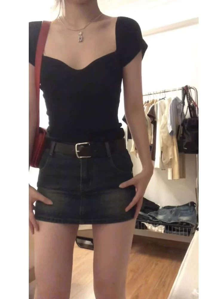 Solid Color Cotton Super Short Short Sleeve T-shirt Women’s Summer New Simple Korean Style Design Sense Niche Blouse Hot Girl Top