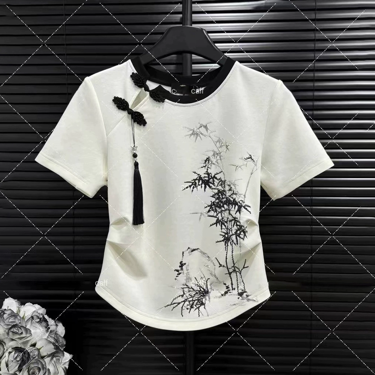 Chinese style national style hot diamond ink bamboo short-sleeved T-shirt for women 2024 summer retro small man short waist slimming top