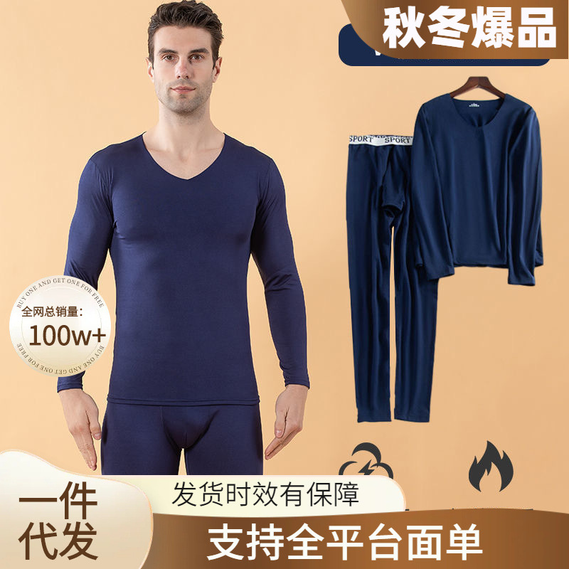 Men’s thermal seamless underwear suit fleece-lined autumn and winter sanding v-neck imitation cationic de Rong autumn pants constant temperature