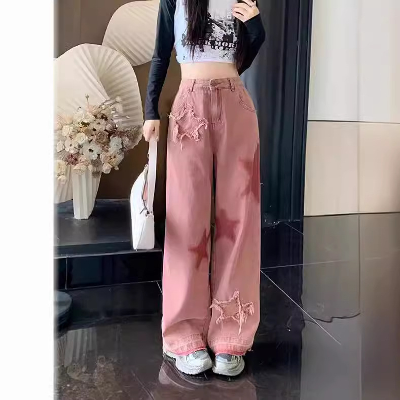American Retro Five-Star Embroidered Contrast Color Fur-edged Jeans 2023 New Arrival Autumn All-match Loose Slimming Trousers for Women