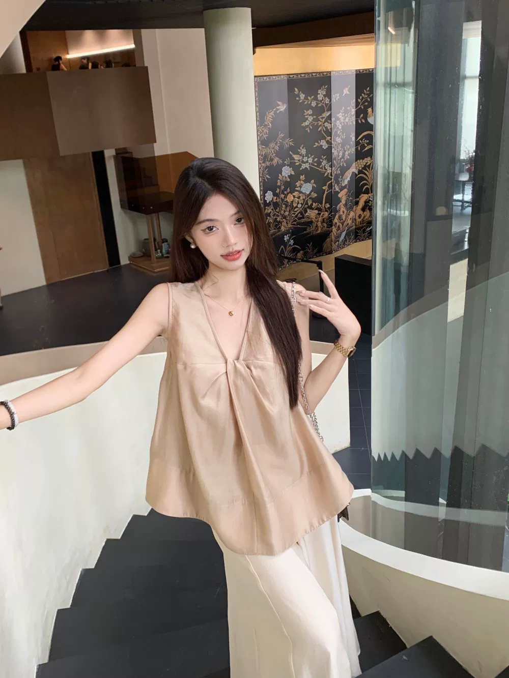 Reversible v-neck twist sleeveless niche loose shirt