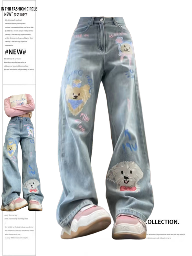 Graffiti national trend dog print straight jeans