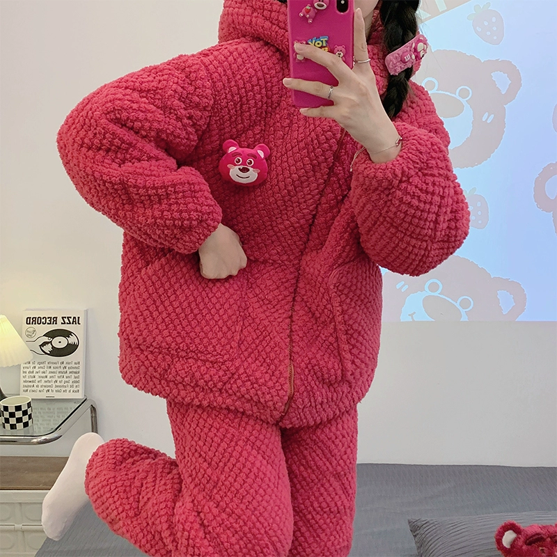 Coral velvet pajamas Female winter plus velvet thickened autumn 2024 new three -layer cotton jacket autumn and winter home service set