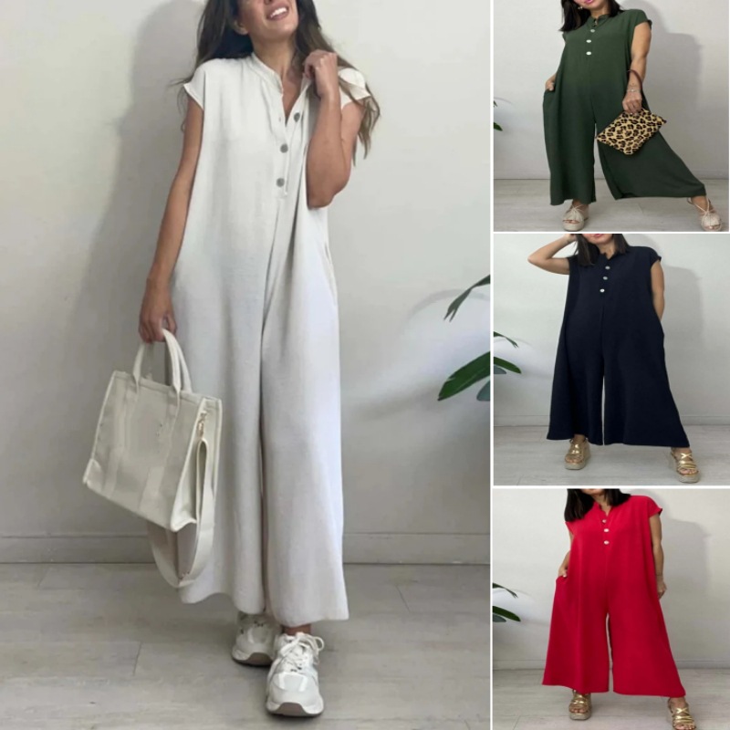 European and American Independent Station Summer New Amazon Women’s Cotton and Linen Solid Color Stand Collar plus size Casual Wide Leg Pants for Women