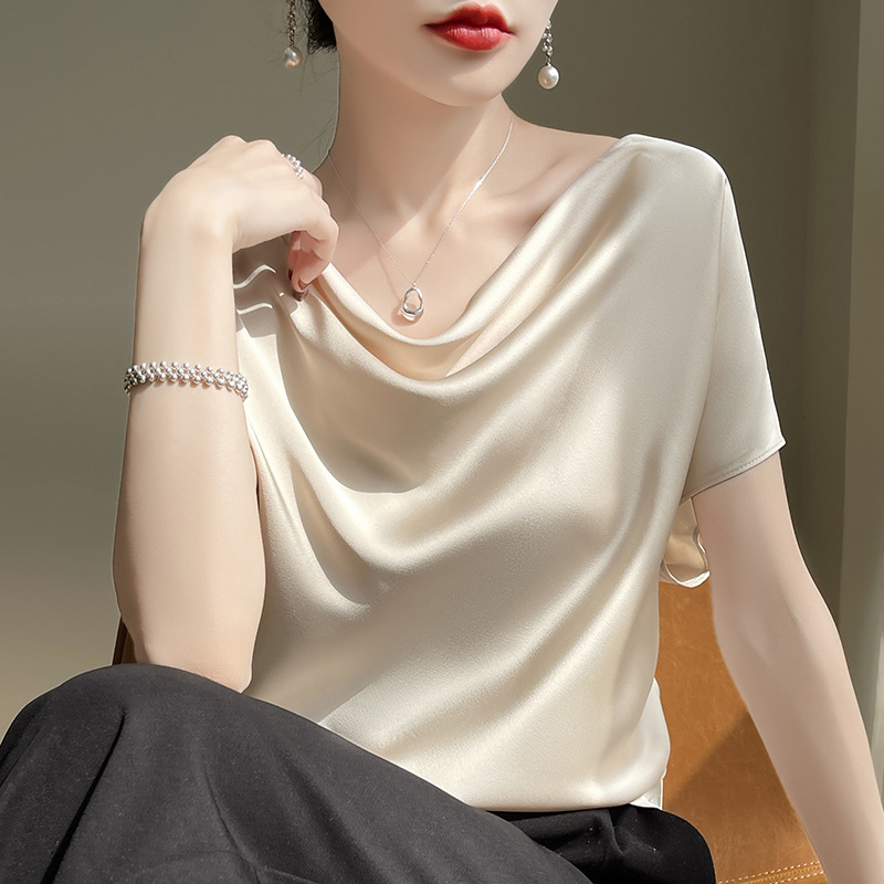 French silk pile collar short sleeve women’s acetate satin top 2024 Summer new mulberry silk T-shirt small shirt