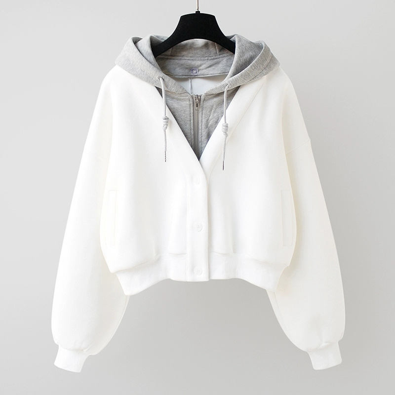Hooded Fake Two-Piece Short Sweater Women’s Wear 2022 Korean Style Stitching Design Sense Fashion Small Sweater Outer Shirt