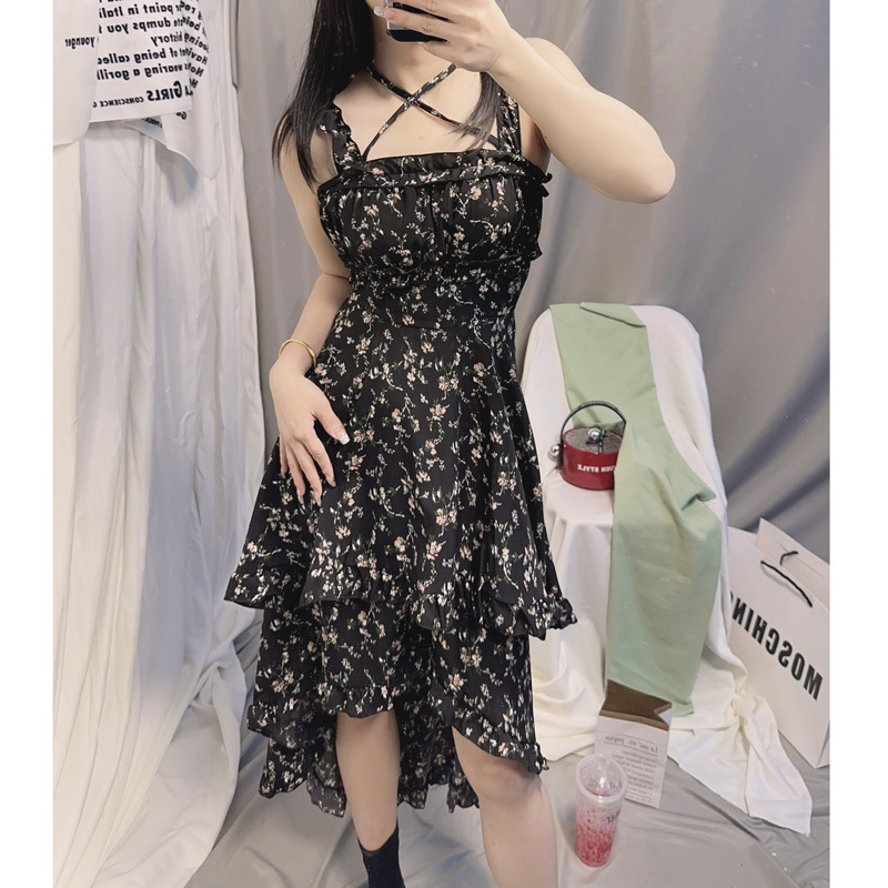 Suspender skirt square collar waist slimming irregular design sense dress 2024 summer new fashion floral