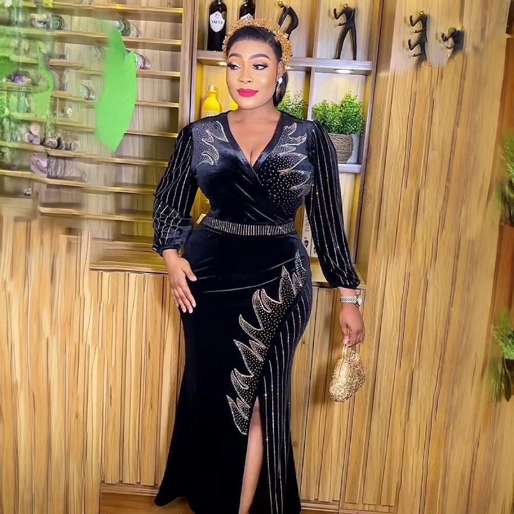 Foreign trade African women’s fishtail skirt elastic gold velvet rhinestone V-neck long sleeve cross-border source in stock