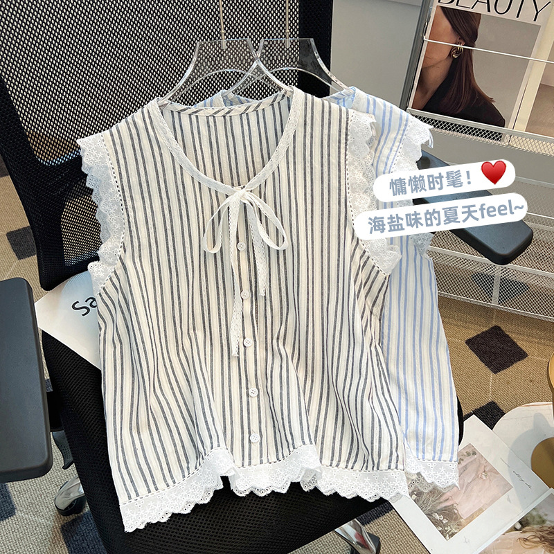 Sleeveless Top Women’s Summer New French Style Retro Striped Shirt Design Niche Lace Stitching Hot Girl Top