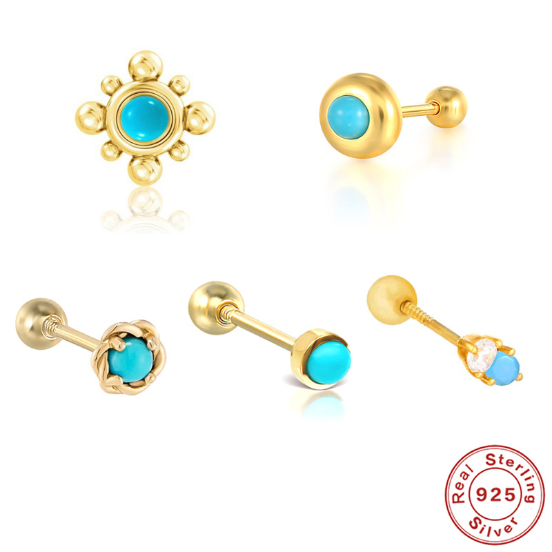 Sterling silver creative retro turquoise ear bone stud spiral small gold ball Piercing cartilage Piercing ear studs Piercing