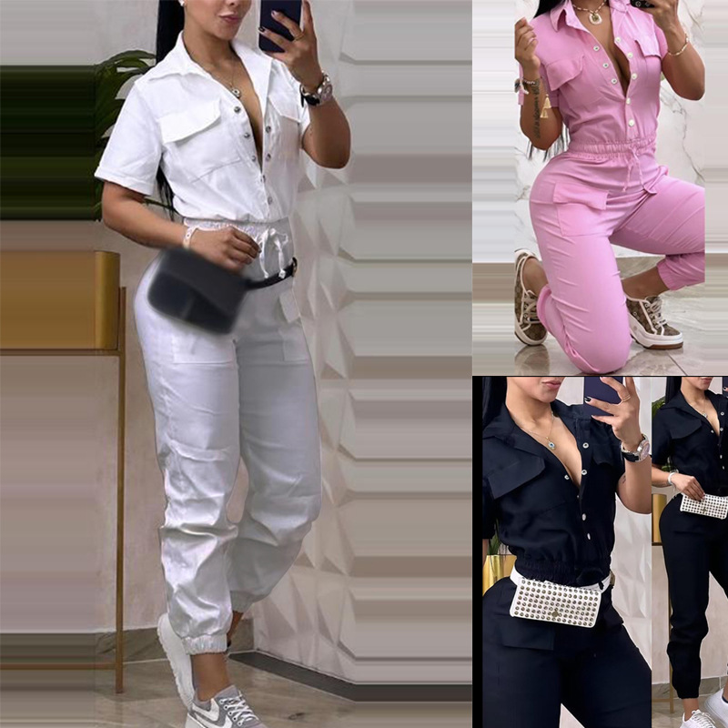 2024 Summer New Amazon European and American Women’s Short-sleeved Single-breasted Pocket Decorative Solid Color Office Jumpsuit Women