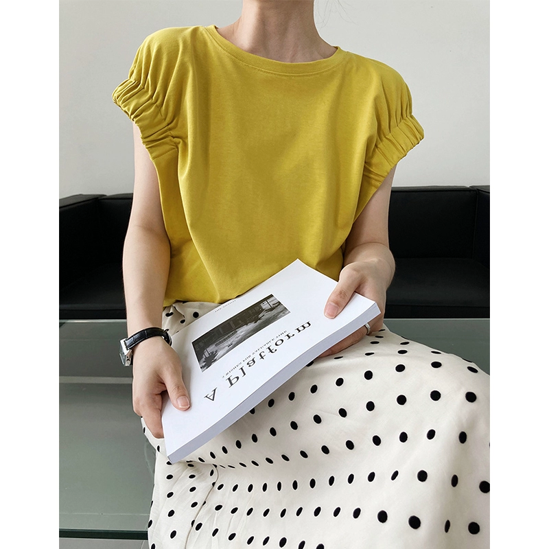 French chic design, niche summer thin, loose cuff folds, thin short -sleeved T -shirts female versatile top