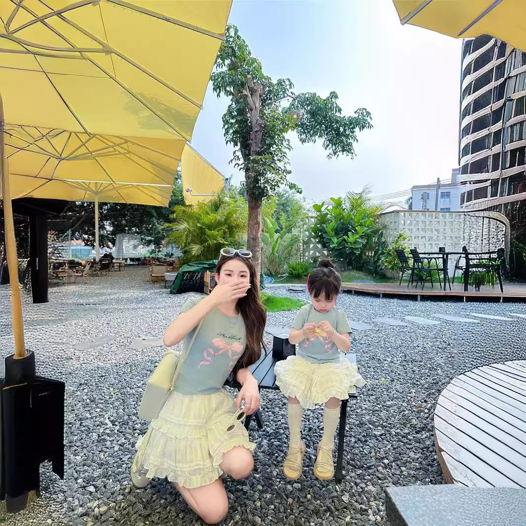 Parent-child 2024 Summer Fashion Short-sleeved suit Lace Skirt Kindergarten Parent-child Activities Family Fashion Mother and Dresses