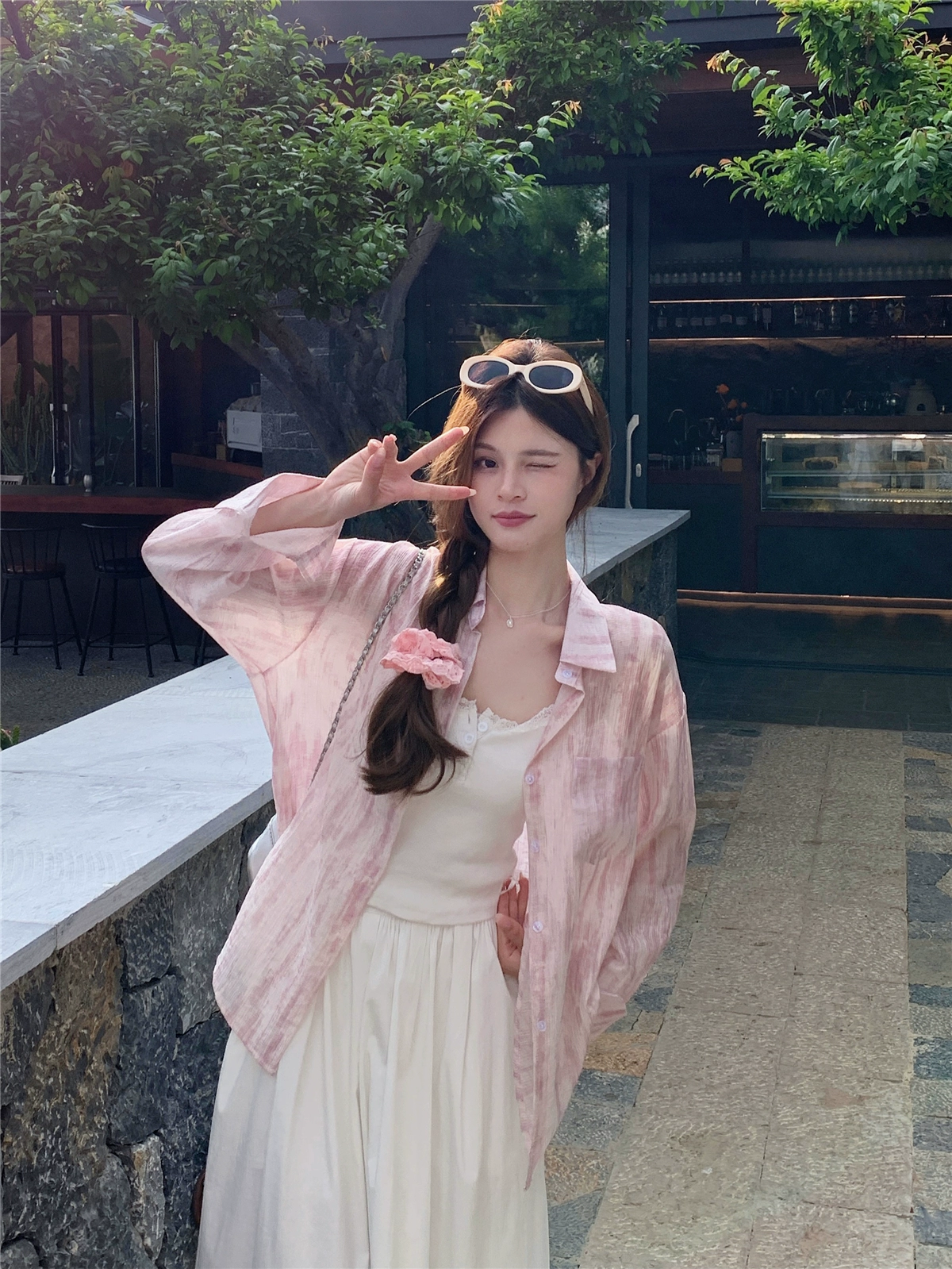 French romantic and gentle atmosphere floral suspender dress + ruffled mesh sun protection shirt two-piece set