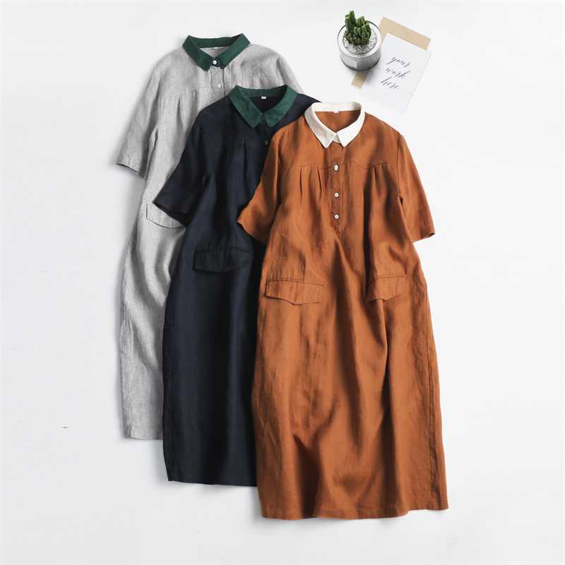 Special Elegant Contrast Collar Linen Short-sleeved Shirt Dress Summer Women’s Artistic All-match dress Comfortable Mid-length Dress