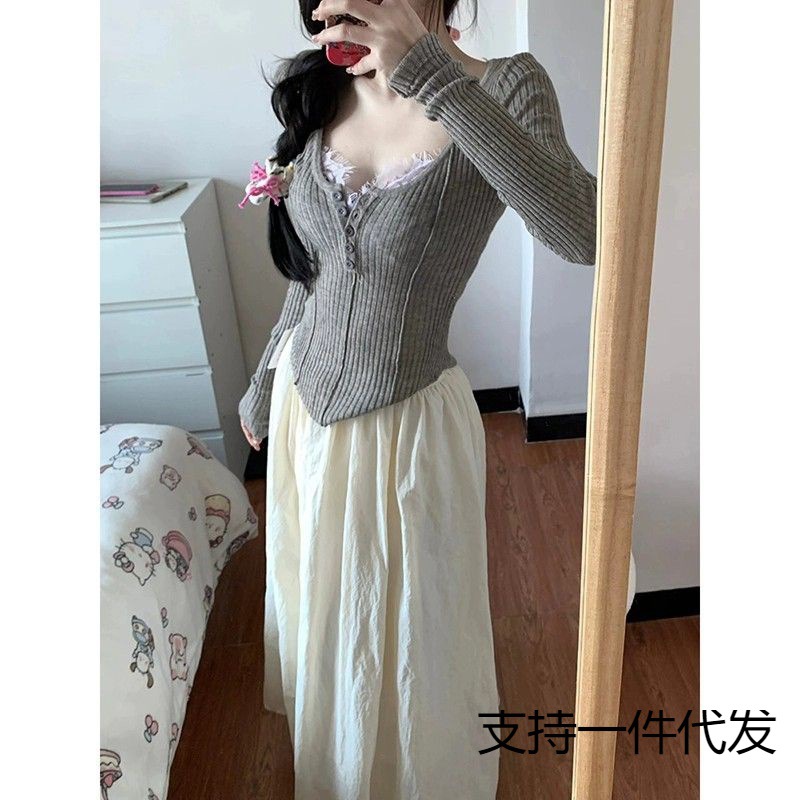 CD Grey Square Collar Knitted Base Shirt Women’s Autumn and Winter Interior Slim-fit Tight Waist Slimming Spice Girl Short Tight Long Sleeve Top