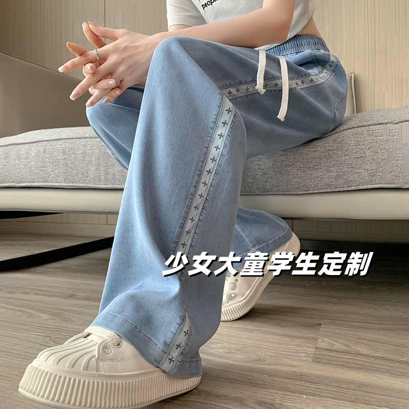 Tencel Jeans Young Girl Big Boy Spring and Summer Thin Junior High School Senior high school Student Loose Casual Straight Ice Silk Wide Leg Pants