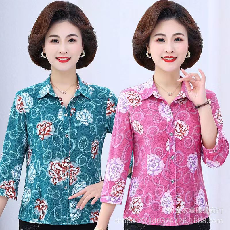 Women’s T-shirt Long-sleeved 2024 Mom Spring and Summer Ice Silk Printed Top Loose Lar Middle-aged and Elderly Women’s T-shirt