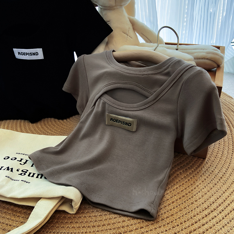 Girls’ summer short-sleeved medium and small children’s western style slim top 2023 new fashionable hollow short women’s summer 0187
