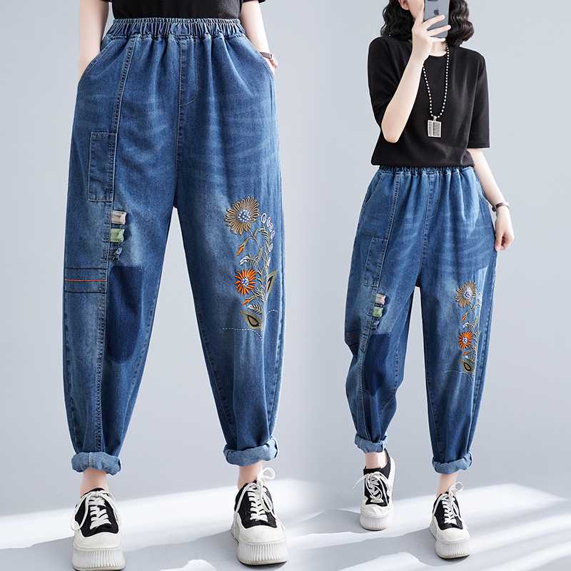 Real shot Harlan stretch 2024 new loose high waist Denim elastic waist plus size patch embroidered thin daddy pants