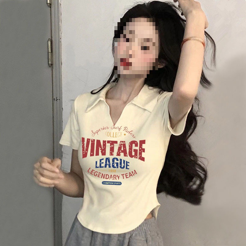 Pure Spice Girl Slim-fit Top Design Sense 2024 New American Polo Shoulder Short-sleeved V-neck T-shirt Women’s Summer