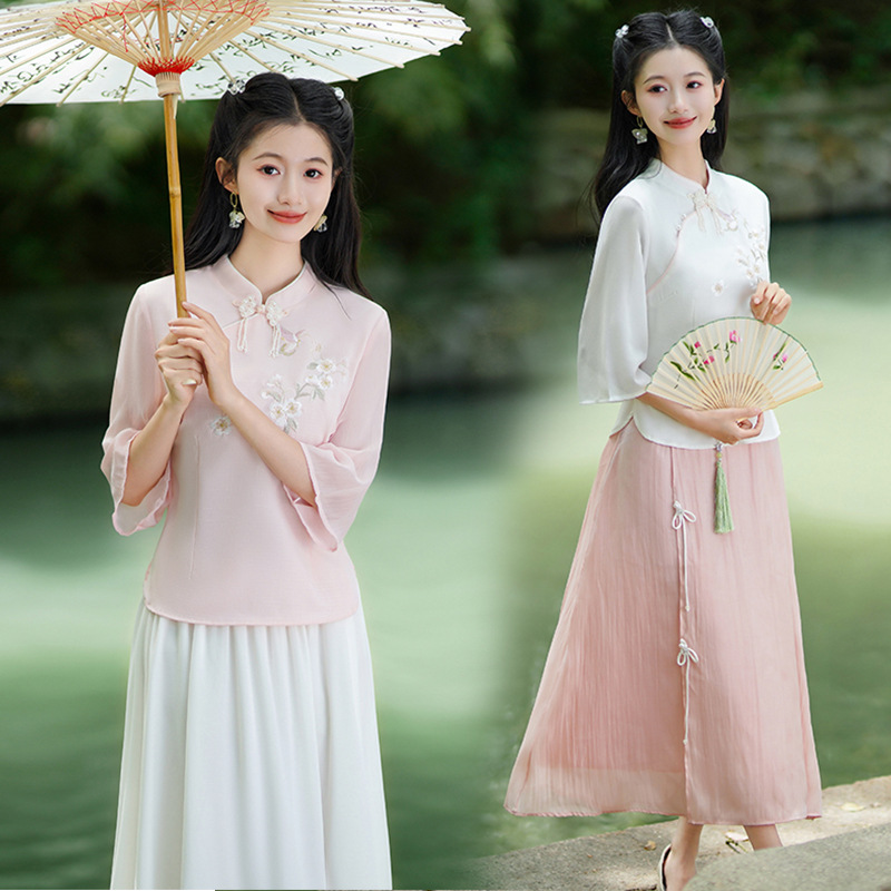 Real shot 2024 new Chinese style retro modified cheongsam embroidered short sleeve jacket retro art girl suit