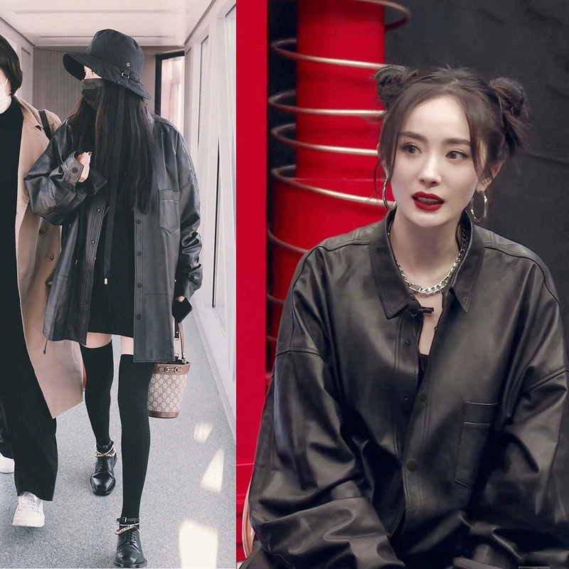 Yang Mi star’s same style women’s spring and autumn French motorcycle PU leather jacket mid-length style black shirt clothes
