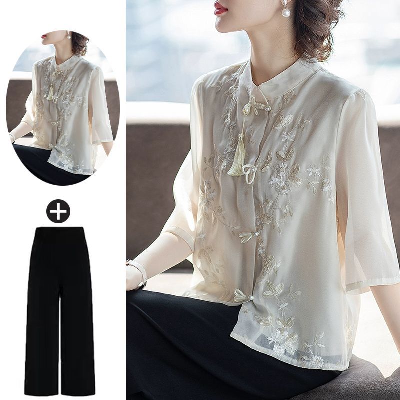 Mother’s Summer Dress suit Fashion Western Style 2024 New Middle-aged and Elderly Women’s Summer Chiffon Shirt 40-year-old Elegant Top
