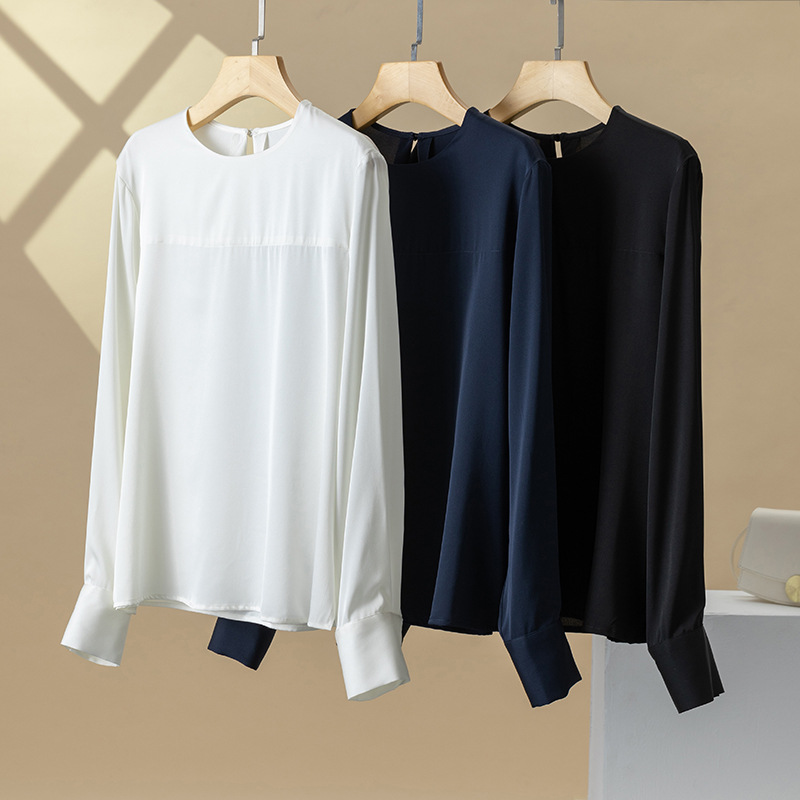 Silk Shirt Women’s Spring and Autumn New 2023 Mulberry Silk All-match Round Neck Long-sleeved Elegant Double Joe Satin Pullover Shirt