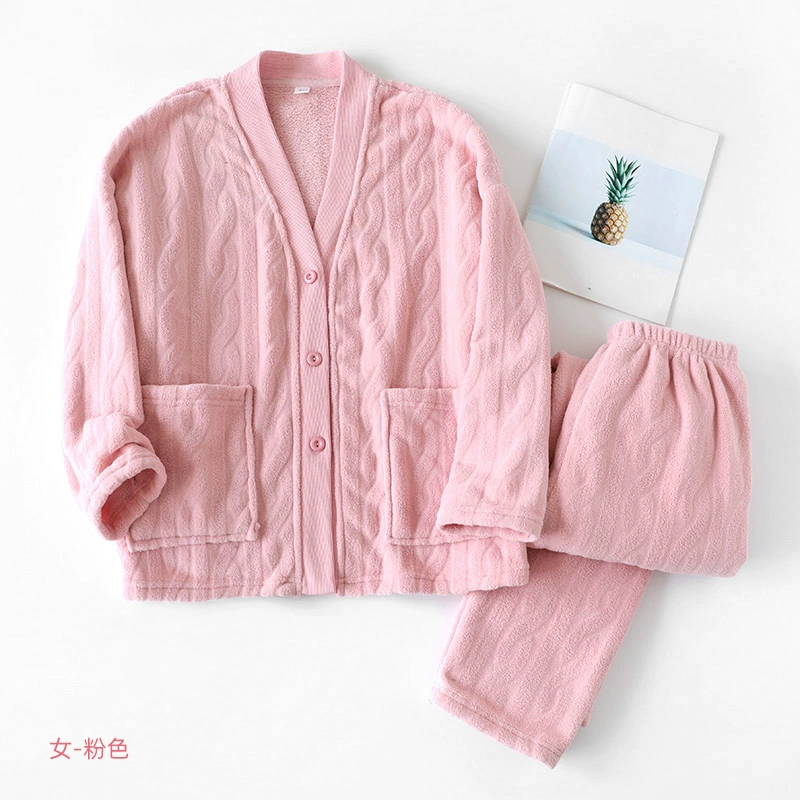 V-neck cardigan couple pajamas coral velvet women’s home wear two-piece suit young and middle-aged men autumn and winter plus velvet thickening