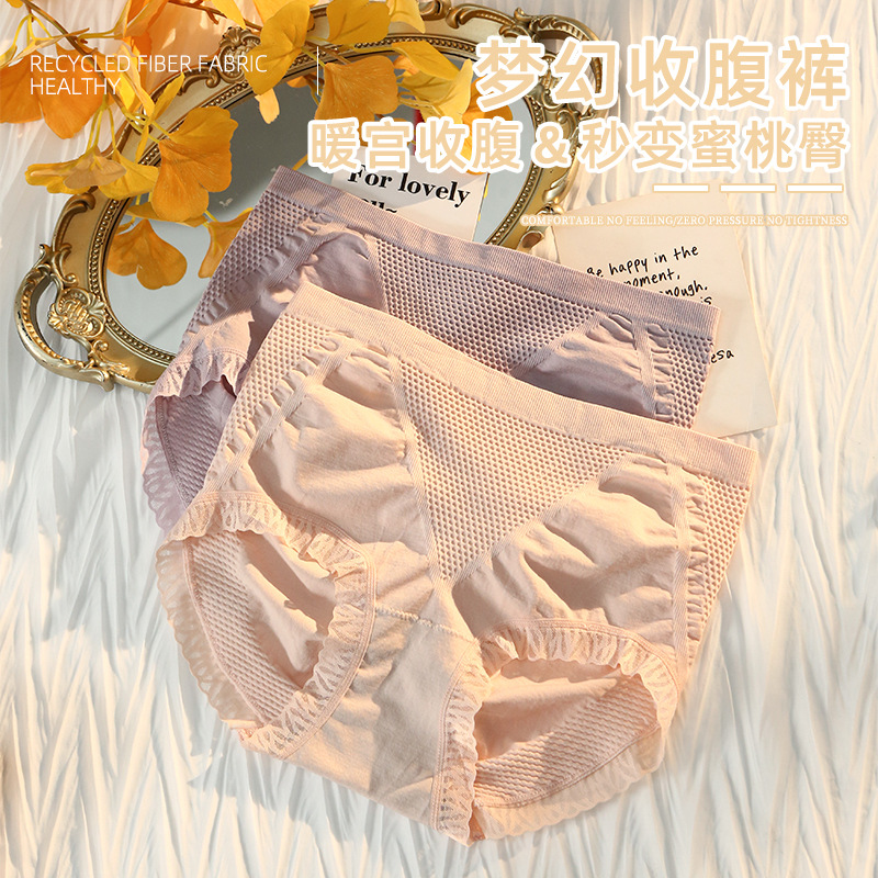 Peach Hip Mid Waist Seamless Ladies Panties Honeycomb Palace Lace Cotton Crotch Briefs Belly Breathable