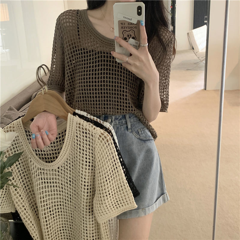 Summer 2024 New Gentle Style Thin Short-sleeved Base Hollow-out Blouse Outer Short Sweater Women’s Top