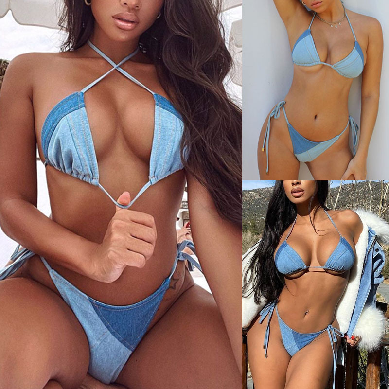 Amazon new European and American denim color matching bikini gathered sexy split swimsuit women SU2370