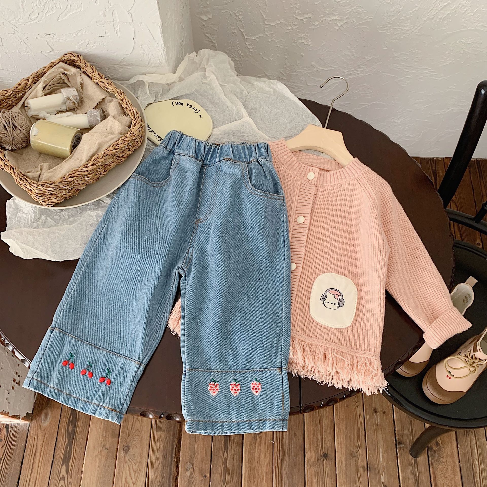 Yicheng children’s clothing 2024 spring new Korean style girls’ embroidered Denim straight pants wide leg pants loose cropped pants