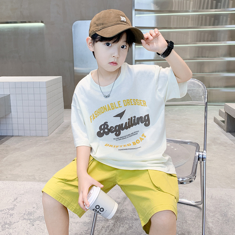 Boys’ Summer Wear suit 2024 New Large Children’s Letter Printed Short-sleeved T-shirt Loose Overalls Two-piece Set