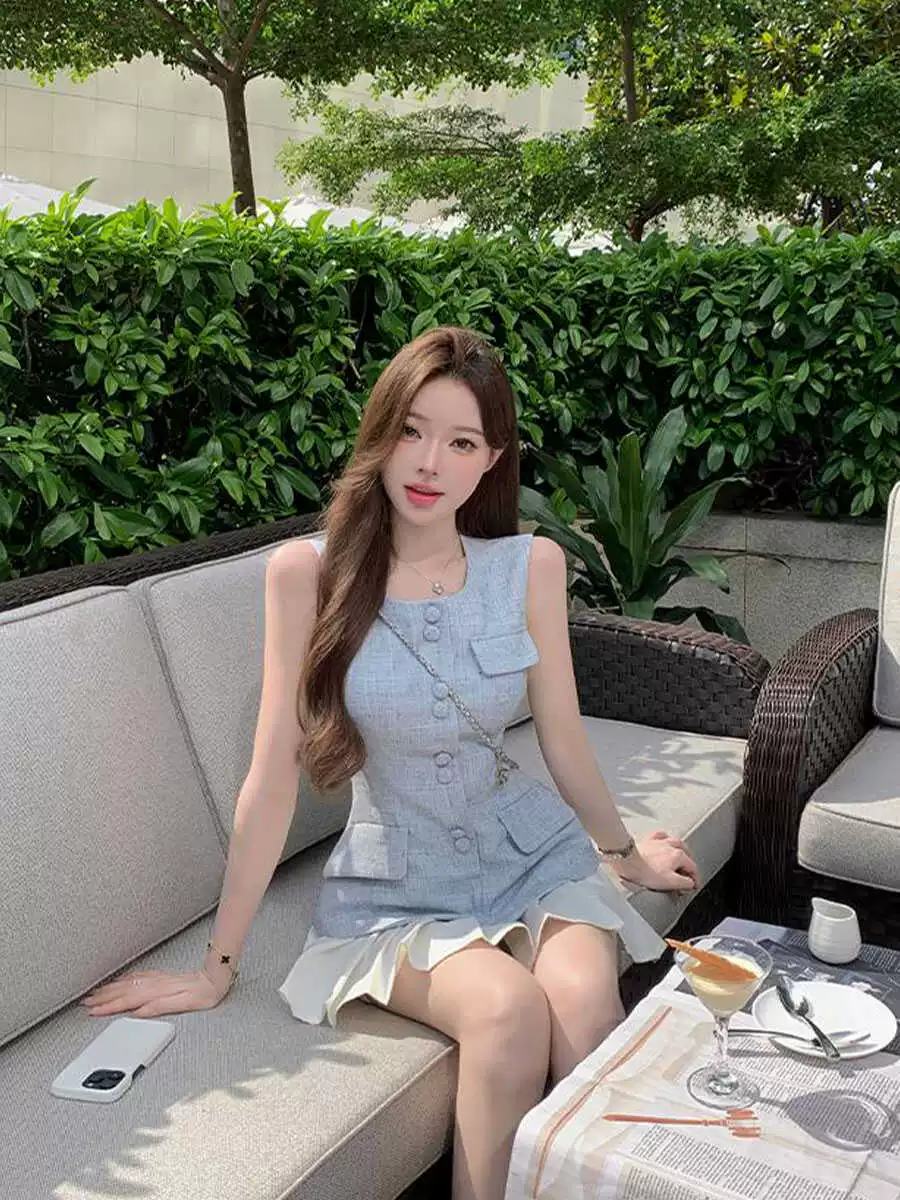 Small Xiangfeng blue pleated skirt vest vest