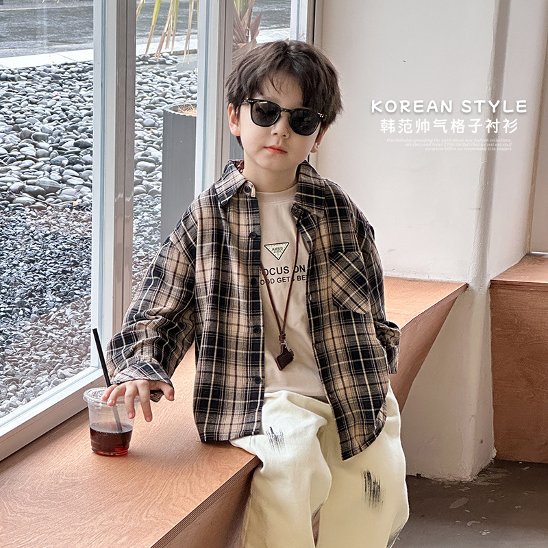 Aimo Beibei 2024 Spring children’s shirt boys’ handsome Korean style lapel top baby loose plaid shirt